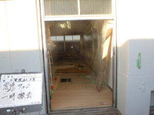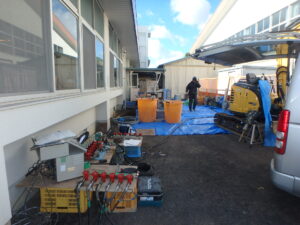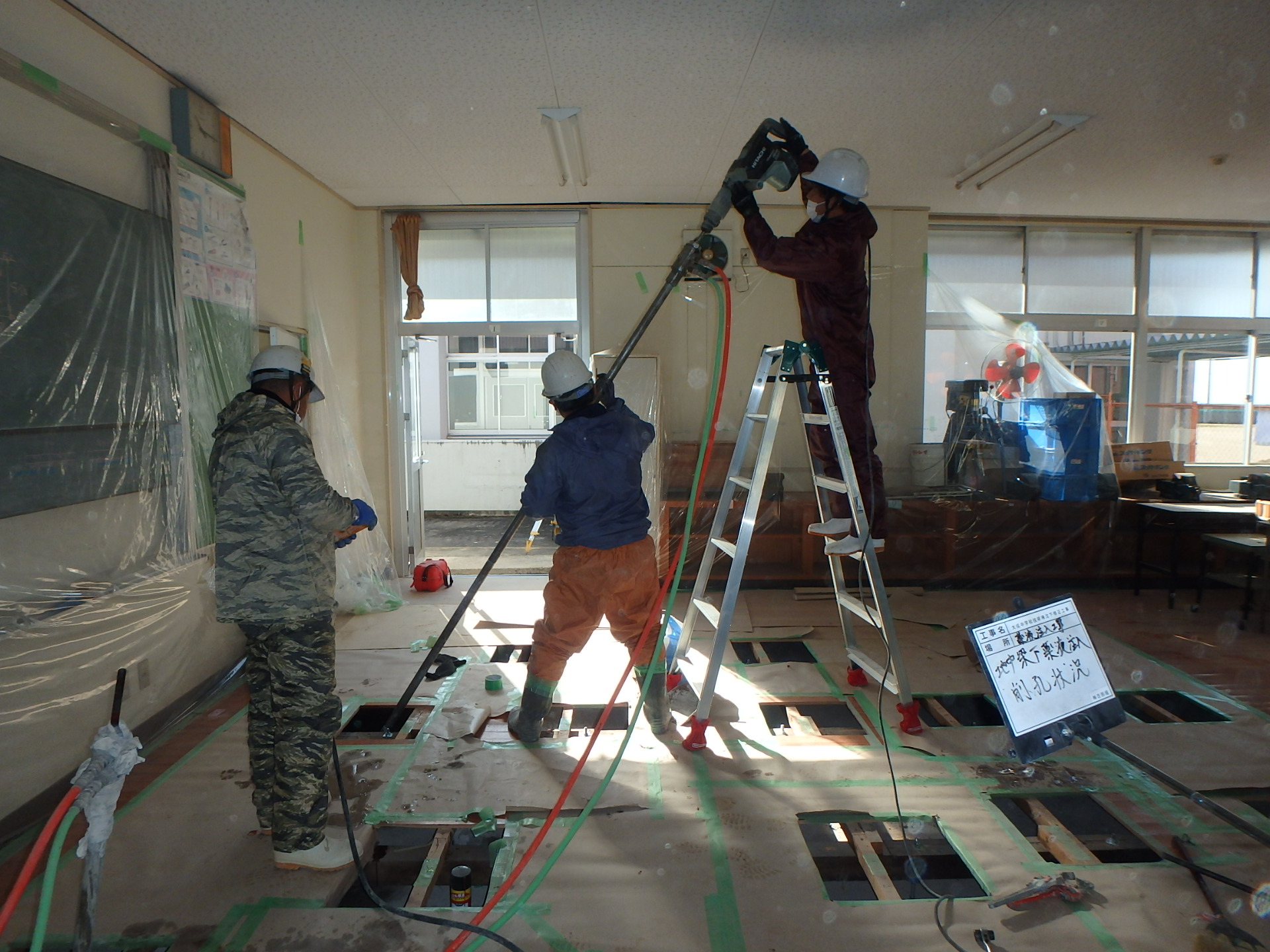 地中梁と土間コンは薬液注入で隆起によりレベル調整します。室内養生、部分床土間解体状況