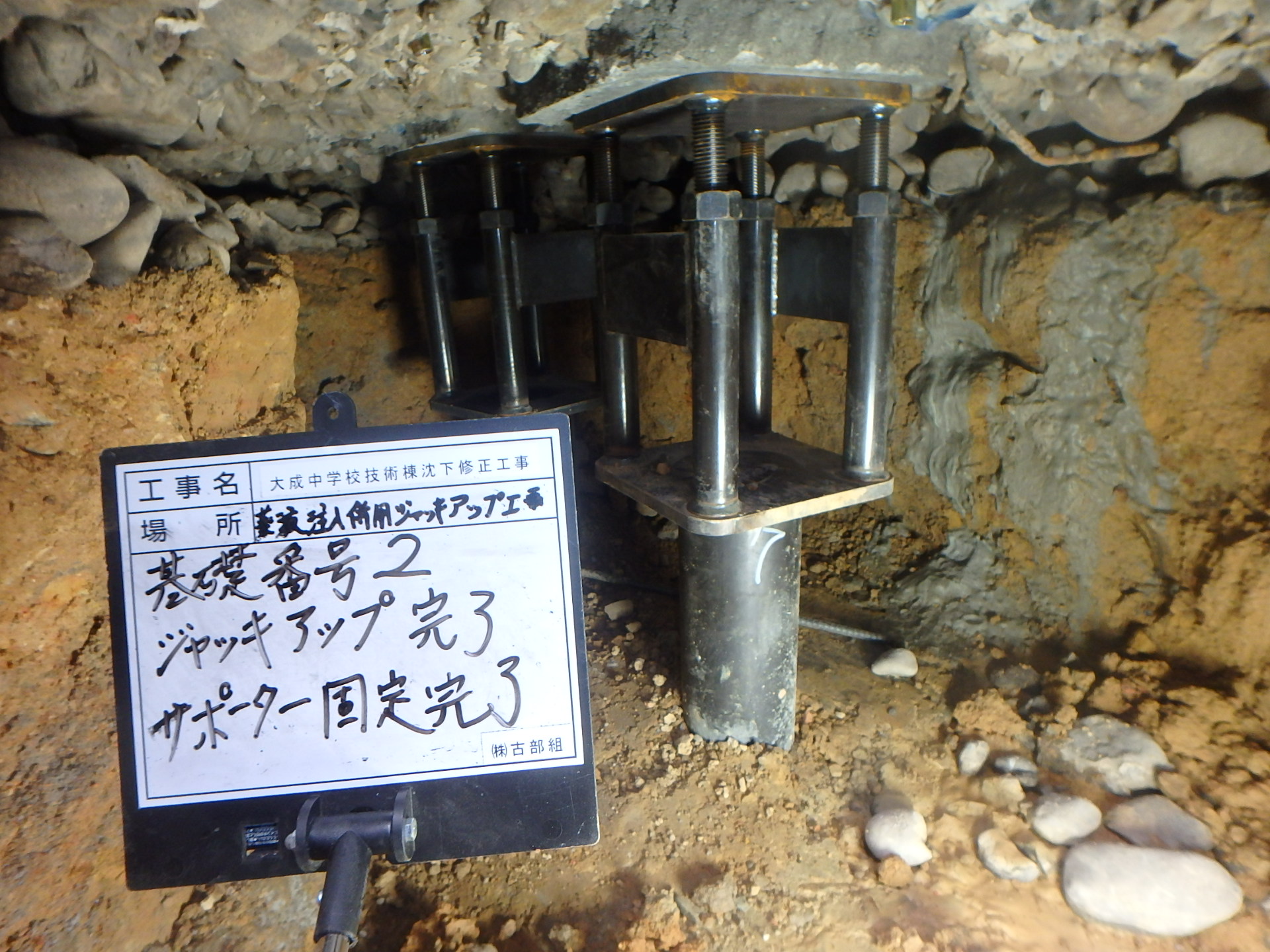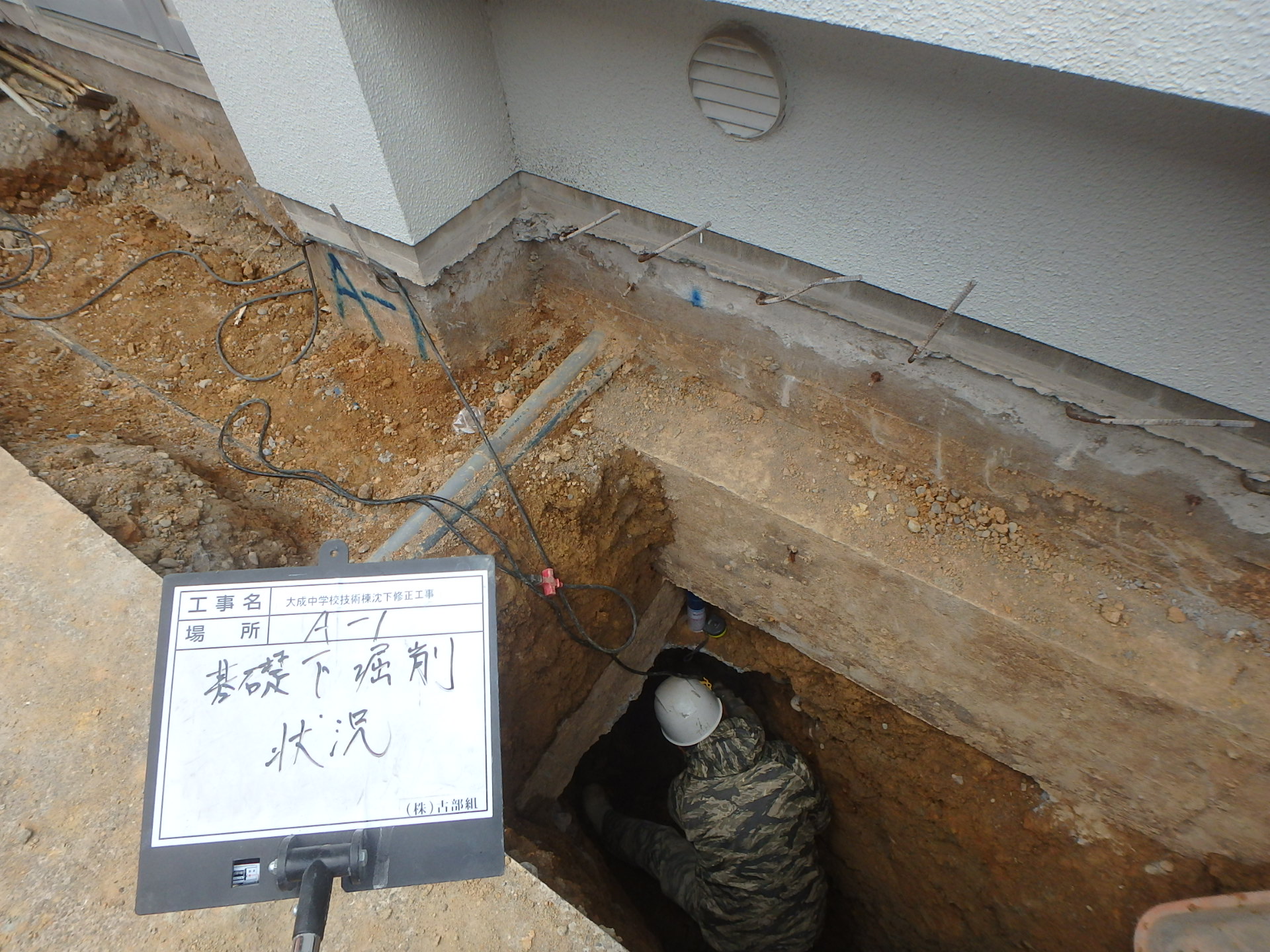 鋼管杭を圧入する為、修正部分の柱基礎下掘削状況